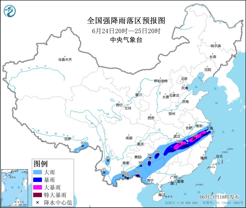 6月24日20时至25日20时,湖南、江西中北部、浙江中北部、安徽南部以及贵州东南部、云南东南部、广西北部和西部等地有大到暴雨,其中,安徽南部、湖南中部、江西中北部、浙江中西部等地部分地区有大暴雨,江西东北部局地特大暴雨(250~270毫米)。上述部分地区伴有短时强降水(最大小时降雨量30~50毫米,局地可超过70毫米),局地有雷暴大风等强对流天气。