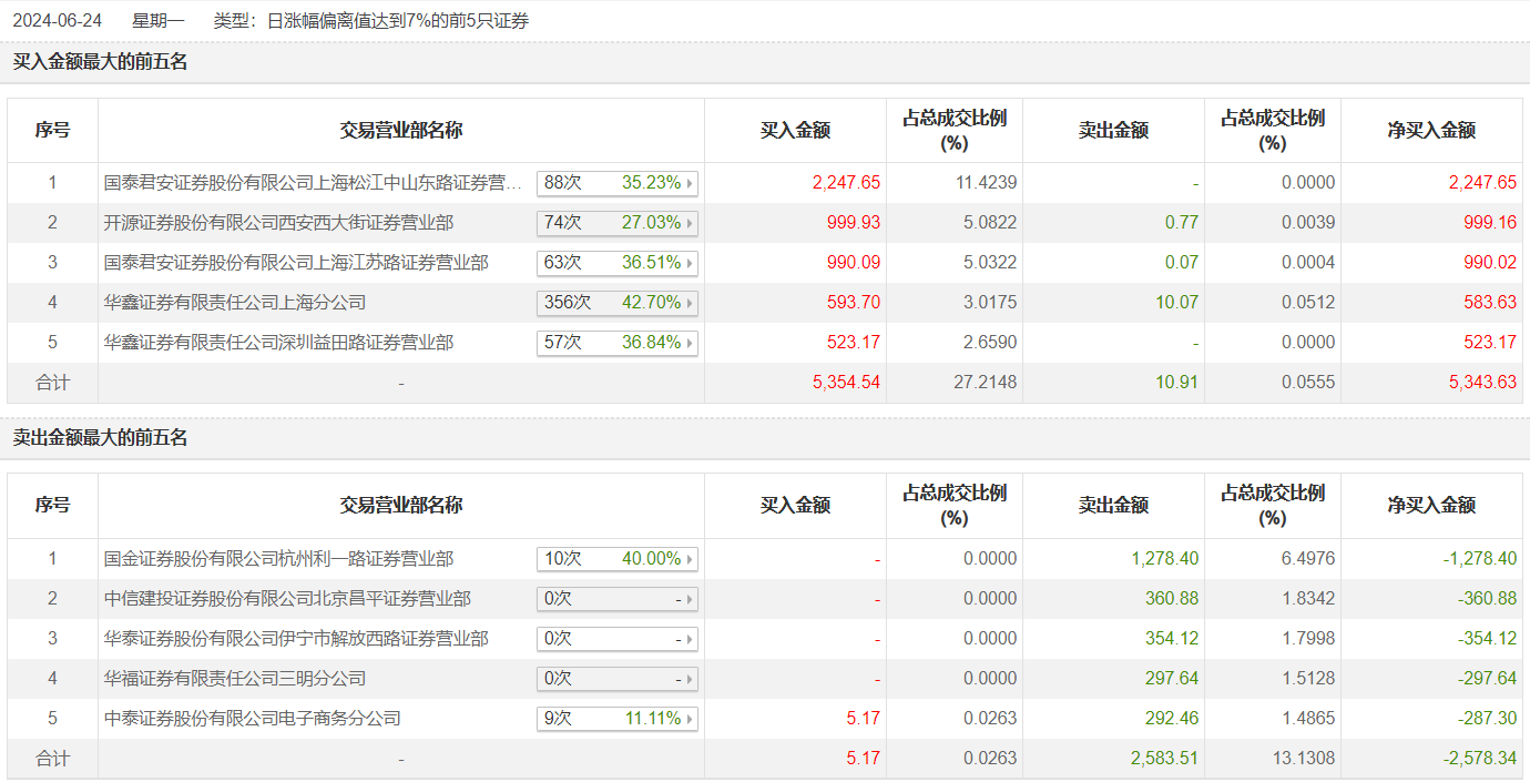 皖通科技6月24日涨停,龙虎榜数据显示,上榜营业部席位全天成交7954.13万元,占当日总成交金额比例为40.43%。其中,买入金额为5359.71万元,卖出金额为2594.42万元,合计净买入2765.29万元。