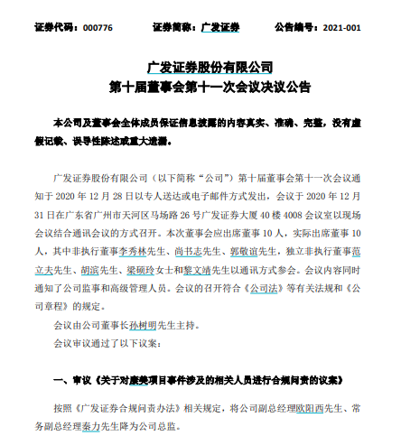 2020年12月,广发证券发布公告称,公司董事会审议通过关于对康美项目事件涉及的相关人员进行合规问责的议案,按照《广发证券合规问责办法》相关规定,将公司副总经理欧阳西、常务副总经理秦力降为公司总监。
