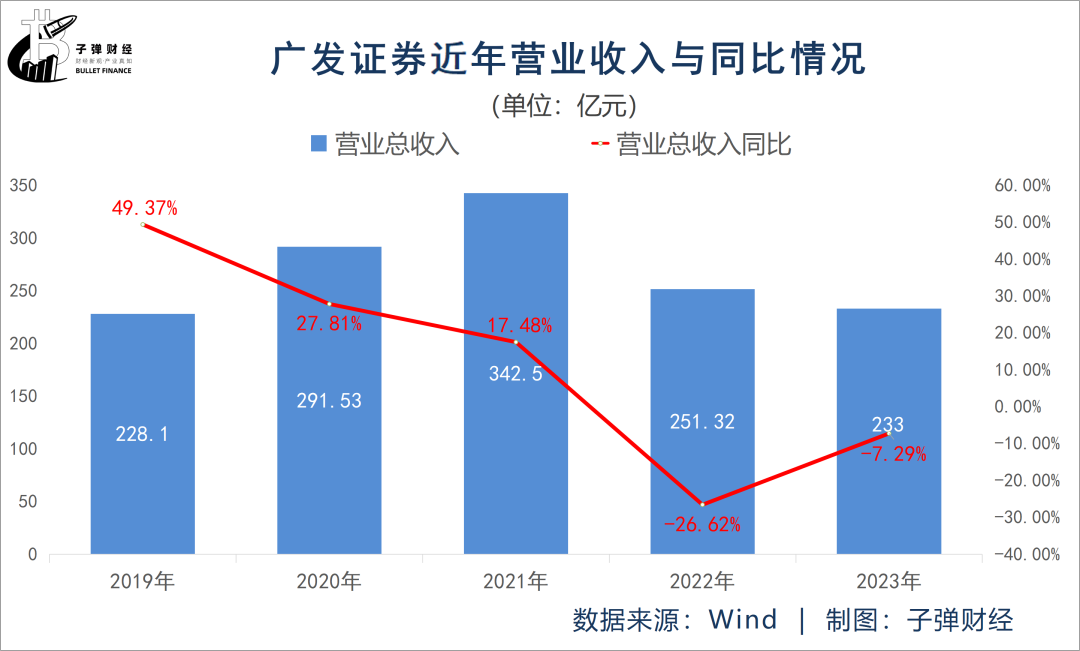 2023年年报显示,广发证券实现营业收入233亿元,同比下降7.29%,归母净利润69.78亿元,同比下降12%。这已经是广发证券连续两年业绩承压,2022年的营业收入和归母净利润亦同比减少了26.62%和26.95%。