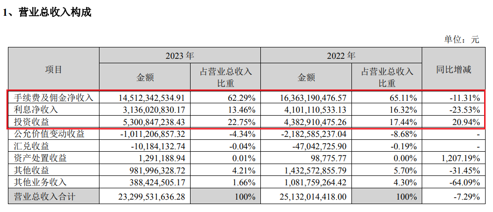 从营收构成来看,广发证券2023年手续费及佣金净收入为145.12亿元,同比减少了11.31%,利息净收入为31.36亿元,同比减少了23.53%;投资收益53亿元,同比增加了20.94%。