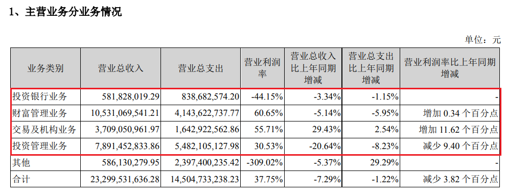 交易及机构业务是唯一实现正向增长的业务板块,2023年这一板块收入37.09亿元,同比增长29.43%。