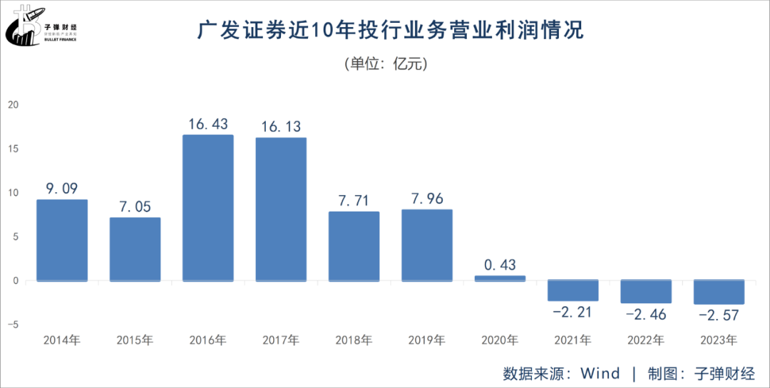 营业利润方面,2023年广发证券投资银行业务实现营业利润-2.57亿元。这已是广发证券投行业务第三年亏损,2021年与2022年营业利润分别为-2.21亿元、-2.46亿元。