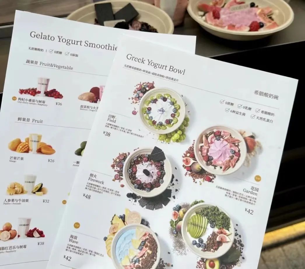 从菜单产品来看,GOOOLDEN的菜单要更简洁,仅有2大产品系——希腊酸奶碗和果蔬昔系列。希腊酸奶碗系列有5种口味,定价在38-42元;果蔬昔系列口味更多,共10种,定价为26-38元。附带蔬果昔的产品设计,也能看出掌舵人对茉酸奶爆品“酸奶奶昔”的看重。