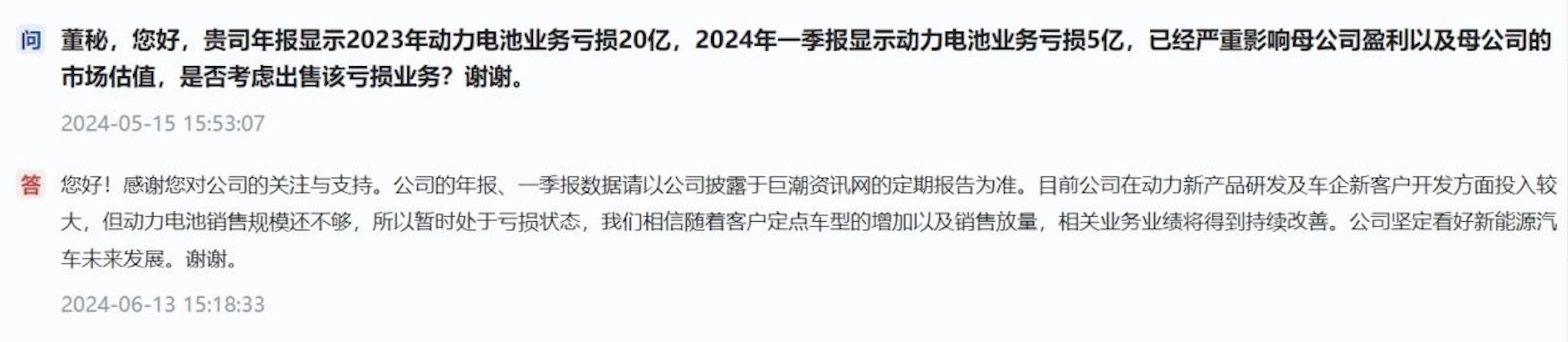 有投资者在欣旺达发布了最新财报后留言,贵司年报显示2023年动力电池业务亏损20亿,2024年一季报显示动力电池业务亏损5亿,已经严重影响母公司盈利以及母公司的市场估值,是否考虑出售该亏损业务?