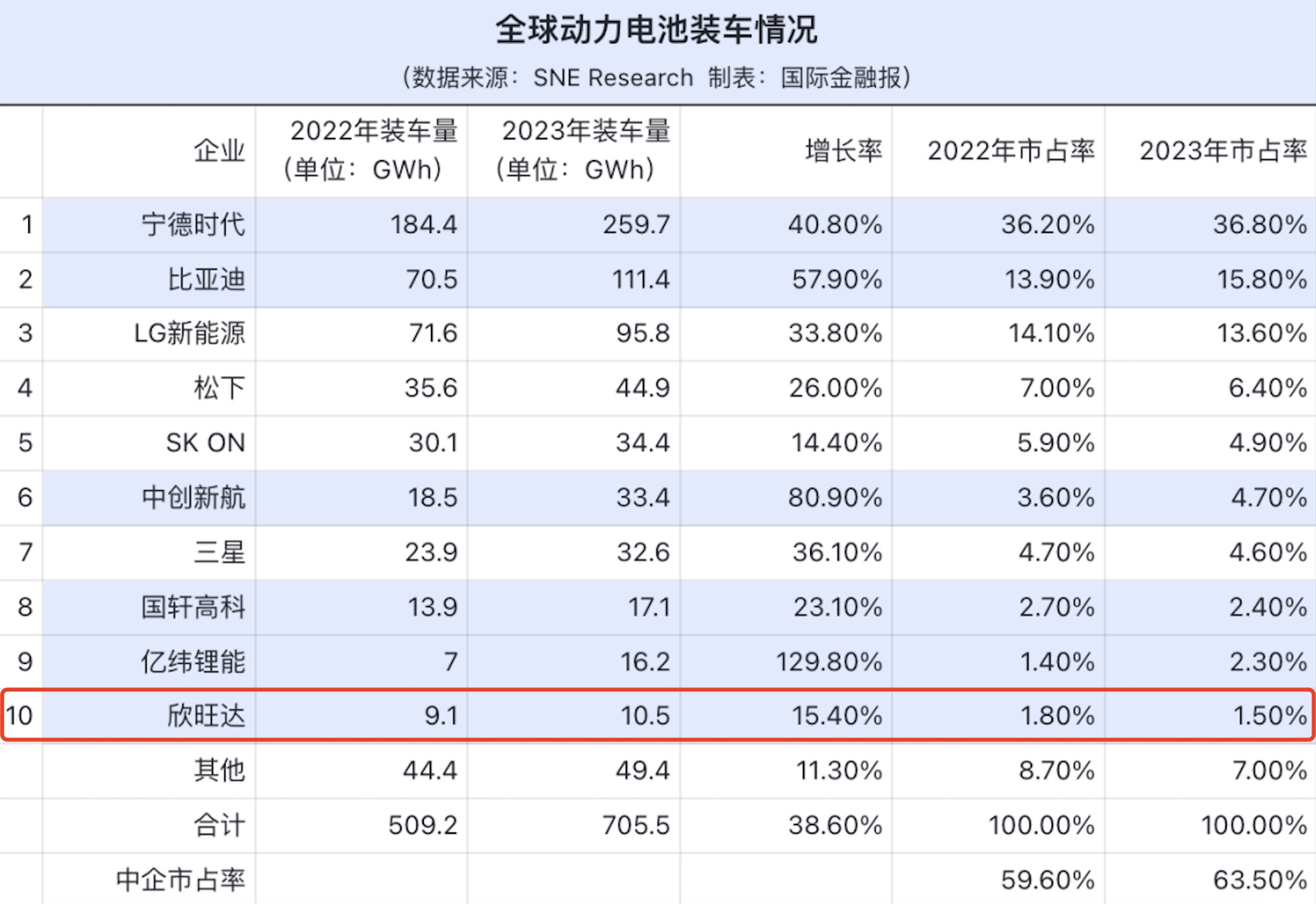 韩国市场研究机构SNE Research公布的2023年全球动力电池装机量显示,欣旺达装机量为10.5GWh,市场份额为1.5%,压哨挤进全球前十,排在它前面的中国企业有5家。