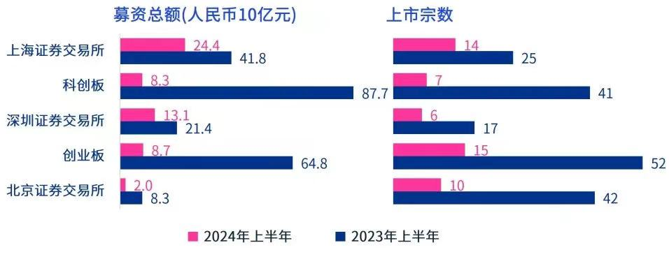 如上图所示,在募资总额和上市宗数方面,2024年上半年相比2023年,严重缩水。