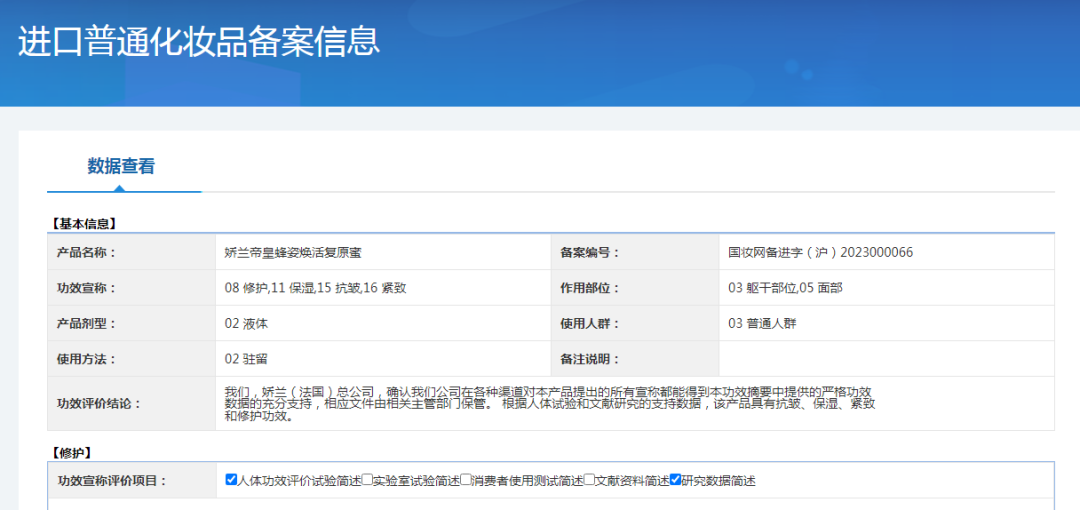 对此,仪美尚查询了国家药品监督管理局进口备案系统。该产品备案信息显示,自2022年12月至2023年1月期间,娇兰黄金复原蜜确实共进行了11次人体功效评价试验,其中,国内实验4次,国外实验7次。