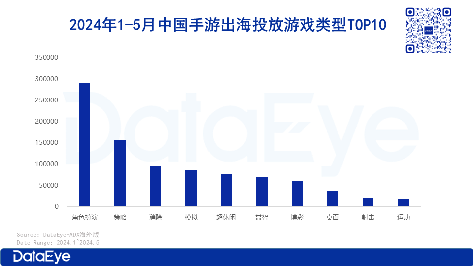 从游戏类型来看,2024年1-5月,中国出海手游投放素材量最高的品类是角色扮演,其次是策略,两者合计占比超过40%,消除、模拟游戏位列第三第四。