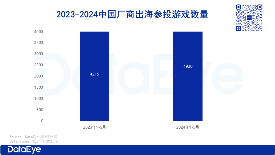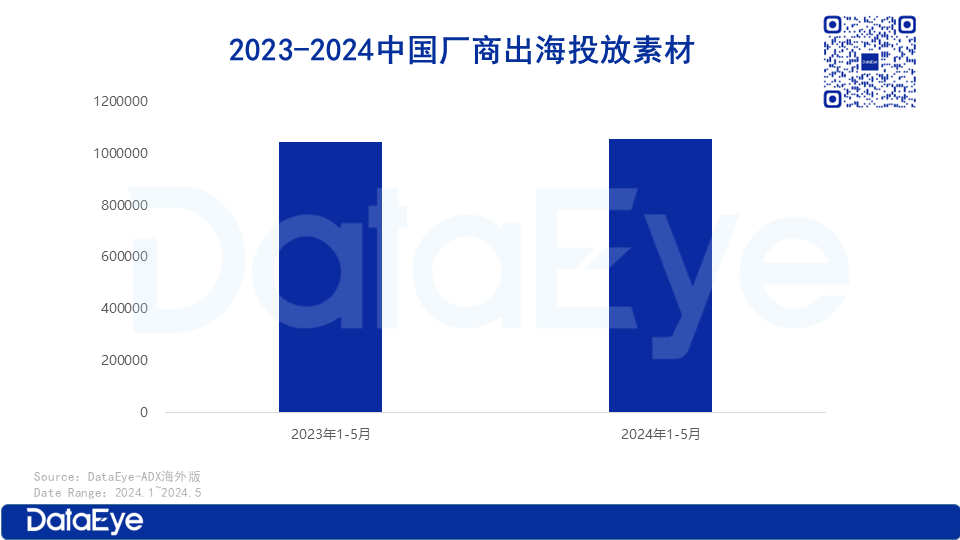 从投放素材总量来看,DataEye数据显示,2024年1-5月,中国出海游戏投放广告素材量约105万,同比增长1.2%。