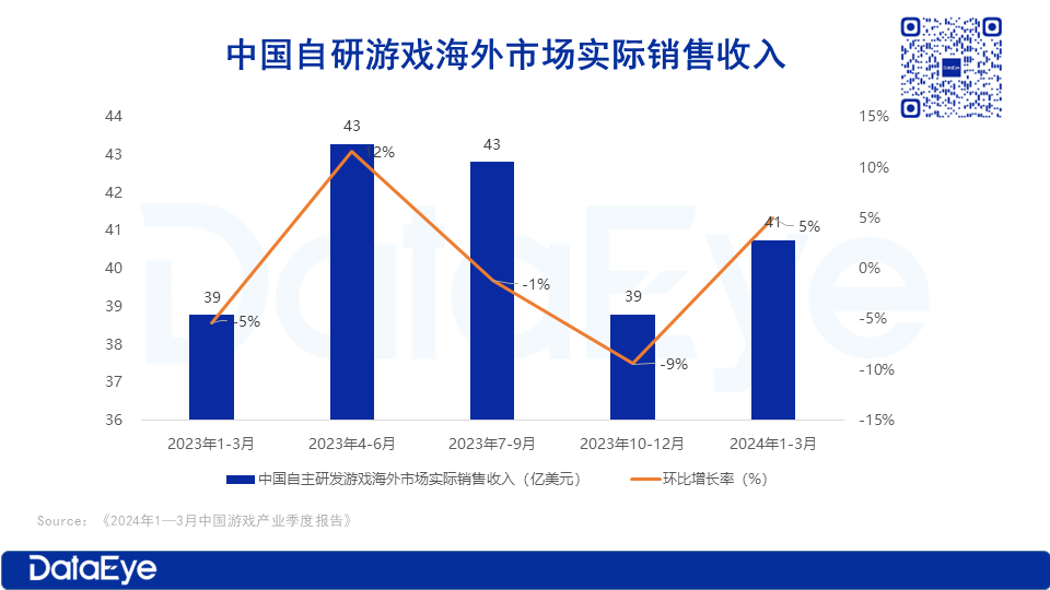 根据伽马数据,2024年Q1,中国自主研发游戏海外市场实际销售收入为40.75亿美元,环比增长5.03%,扭转了连续两个季度下降的局面。
