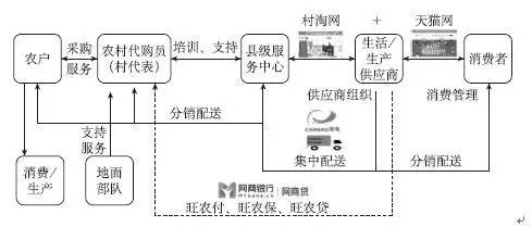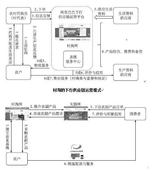 在供应链运营模式上,阿里的村淘主要采用了双向运营模式,即快消品或生产资料的下行供应链,以及农副产品的上行供应链。