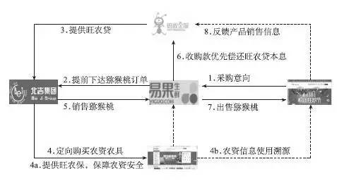 具体的金融服务业务流程是:首先易果生鲜为锁定优质猕猴桃产品,提前提供采购订单;随后蚂蚁金服为生产合作社提供生产经营旺农贷;旺农贷定向支付用于购买农资农具,并且旺农保提供农资保障险用于农资安全保证,而且能通过村淘实现农资使用信息溯源;待猕猴桃上市,合作社供应给易果生鲜;易果生鲜的收购款优先偿还旺农贷本息;最后,由易果生鲜在天猫上进行推介销售。