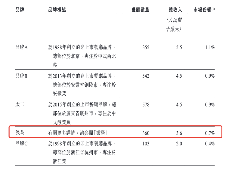 根据灼识咨询数据,2023年,在人均价格50元到100元的中国休闲中式餐厅品牌中,按餐厅数量排名,绿茶餐厅位于行业第三;按收入排名,绿茶餐厅位于行业第四,市占率为0.7%,行业前三分别为西贝莜面村、小菜园和太二,市占率分别为1.1%、0.9%和0.9%。