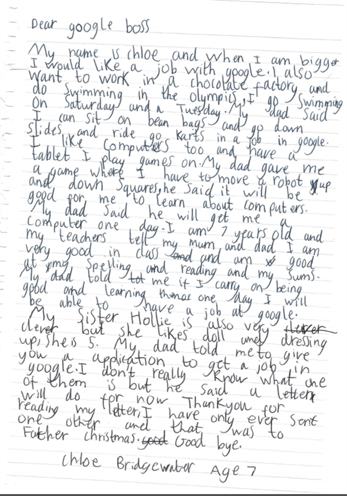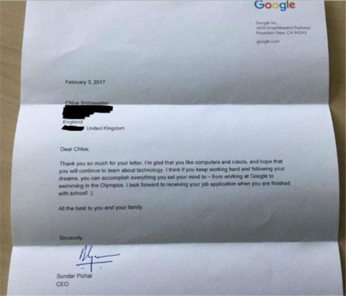 和所有7岁的孩子一样,来自英国赫里福德的克罗埃·布里奇沃特也有一个远大的梦想。除了想要成为奥运会游泳冠军、在巧克力工厂上班之外,她还想要获得谷歌的工作机会。不同于同龄孩子的是,克罗埃有着出众的追求精神和一往无前的执着,她最近甚至还谷歌CEO寄送了一封手写的“求职信”。