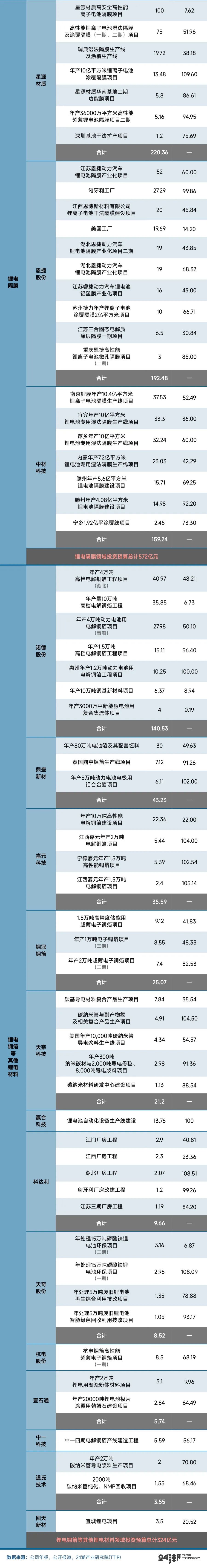 据24潮产业研究院(TTIR)统计,截止2023年末,国内70家锂电上市公司的325个超级工程(单个项目投资预算在亿元以上)进入执行(施工)阶段,这325个项目总投资预算超8600亿元,涵盖锂电池制造、钴锂镍等上游原材料、正负极材料、电解液、锂电隔膜、锂电铜箔等整个锂电池产业链。