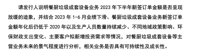 根据二轮问询函披露,开诚生态2023年1-6月、1-8月餐厨垃圾成套设备业务新签订单金额分别为1.60亿元、1.72亿元,报告期各期(2020年至2023年上半年)该业务的生产人员分别为74人、91人、65人和53人,数量持续减少。
