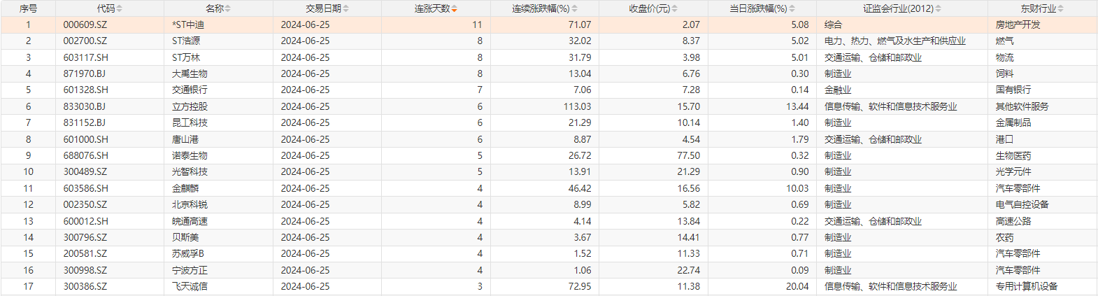 6月25日公告,Choice数据统计,今日1只个股连续11天上涨,为*ST中迪;3只个股连续8天上涨,包括大禹生物、ST浩源、ST万林;此外,交通银行连续7天上涨;立方控股、昆工科技、唐山港3只个股连续6天上涨。