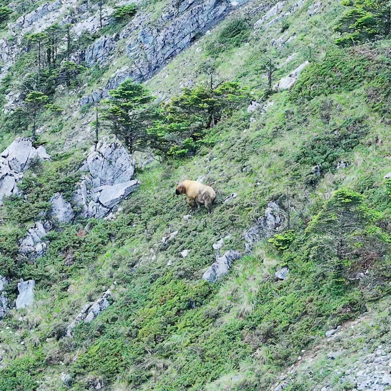 “快看,羚牛!”一声惊呼让大家激动起来。在月亮湾旁海拔3600米的八卦顶接近山顶的地方,一头雄壮的羚牛正在吃草。它看了看巡护队,然后不疾不徐地离开,隐没到山的另一边。大家用相机、无人机记录下羚牛出现的全过程。这是巡护队几天来,难得的与野生珍稀动物近距离接触的经历。据介绍,扭角羚又叫羚牛、大白羊、金毛扭角羚,由于它的脸似驼鹿,两角似角马,背脊似棕熊,后腿似斑鬣狗,四肢似牛,尾巴似羊,因此人们给它起了另外的别称叫“六不像”。扭角羚一般是群居,单只出现说明它在家族中竞争失败,被赶出家族。因此,相对来说,单只的扭角羚性情较为残暴。