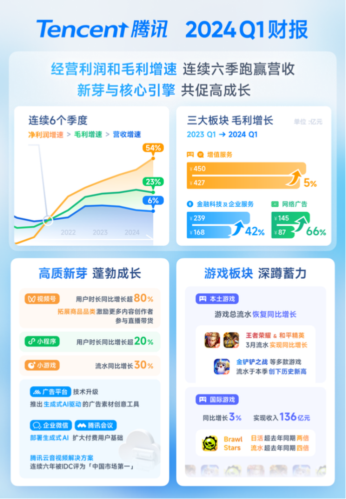 腾讯2024年Q1财报显示,视频号的用户时长同比增长超80%,拓展商品品类激励更多创作者参与直播带货,在一定程度上拉动腾讯广告收入同比增长66%。