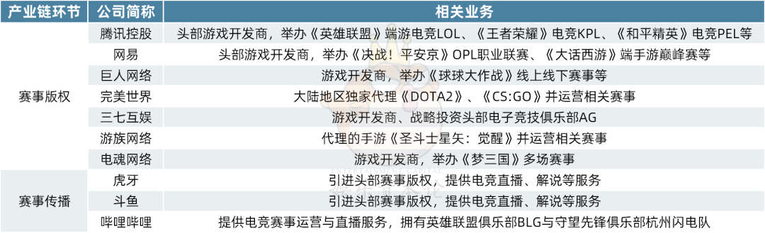 如前文所述,当前的国内电竞生态链由赛事+直播两部分构成。电竞产业链中,主要的环节包括赛事版权、赛事执行、赛事运营、赛事传播。无论是国内还是国外,多数上市公司都集中在首尾两个环节,如游戏开发商腾讯、网易,内容传播平台哔哩哔哩、虎牙、斗鱼等。而中间环节即使有上市公司,体量也远小于游戏开发与内容传播。
