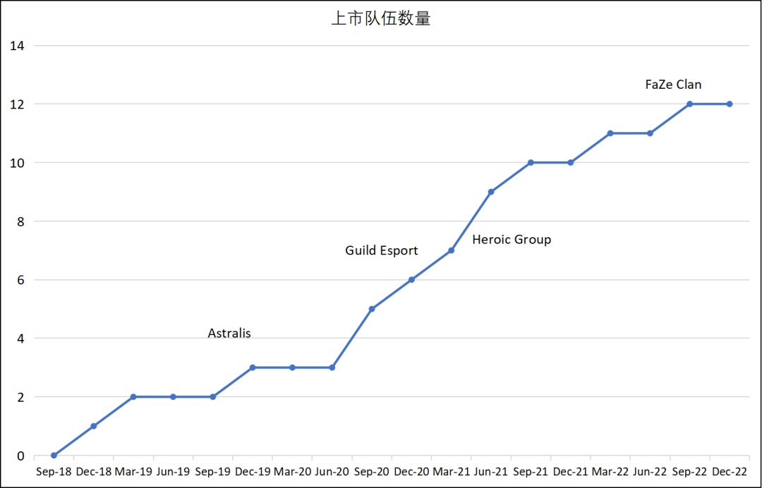图3 海外上市电竞战队数量,数据来源:ESPORTS INSIDER,包括已上市的电子竞技组织(如图中所示)和被上市公司收购的队伍
