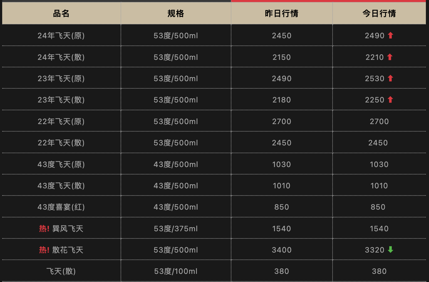 今日酒价披露的最新参考价显示:24年飞天茅台散瓶批发参考价从前一日的2150元上涨至2210元。原箱的24年飞天茅台的批发参考价涨至2490元/瓶,昨日2450元/瓶。