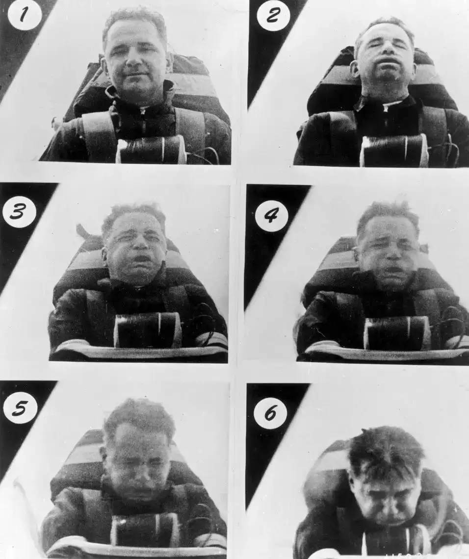 斯塔普博士给我们带来的是极限数据,然而常人在3G的加速度条件下就会产生严重的头晕恶心呕吐症状,在5G条件下心脑血管会严重受损有生命危险,除非你是一名经过专业训练的宇航员或者飞行员。