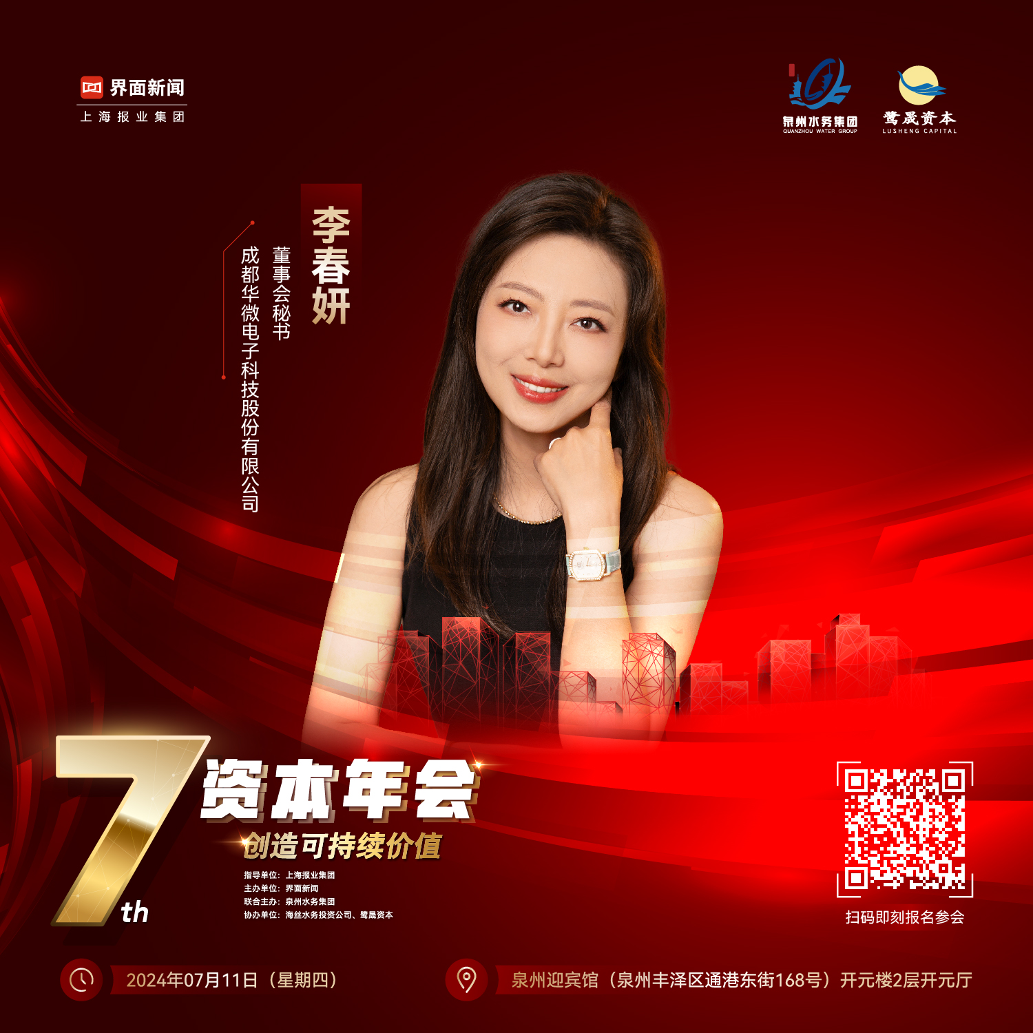由上海报业集团作为指导单位,界面新闻主办、泉州水务集团有限公司联合主办,泉州海丝水务投资有限责任公司、泉州鹭晟私募基金管理有限公司作为协办单位 【2024资本年会】确认将于7月11日(星期四)在泉州迎宾馆(泉州丰泽区通港东街168号)举行。(点击“2024资本年会”即刻锁定年会参会名额)