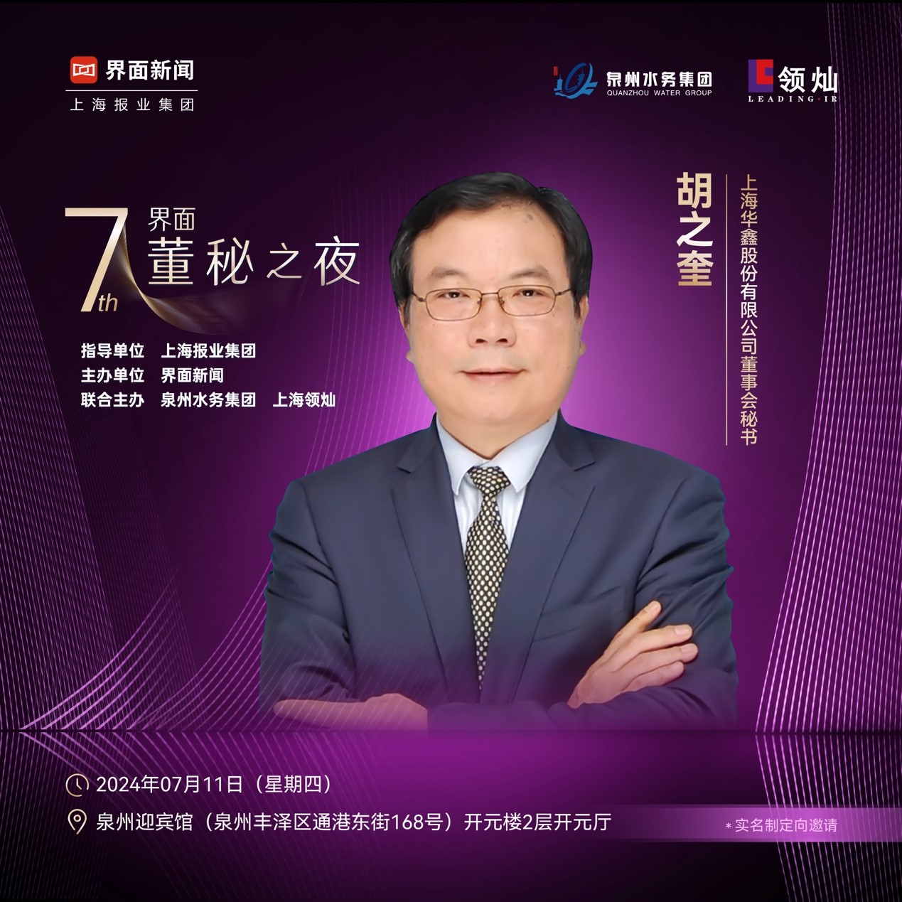 上海华鑫股份有限公司董事会秘书胡之奎确认出席【2024董秘之夜】。与此同时,晚宴现场,联合主办方泉州水务集团有限公司、上海领灿也将带来精彩纷呈的专业分享、解读。