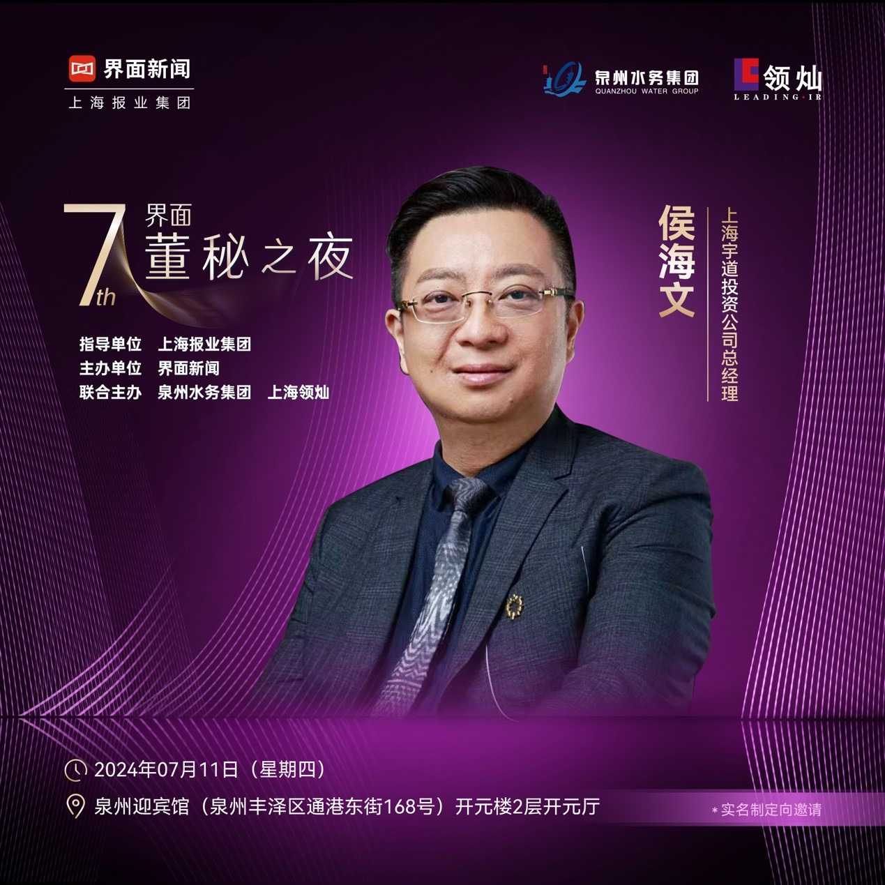 上海宇道投资公司总经理侯海文确认出席【2024董秘之夜】。与此同时,晚宴现场,联合主办方泉州水务集团有限公司、上海领灿也将带来精彩纷呈的专业分享、解读。