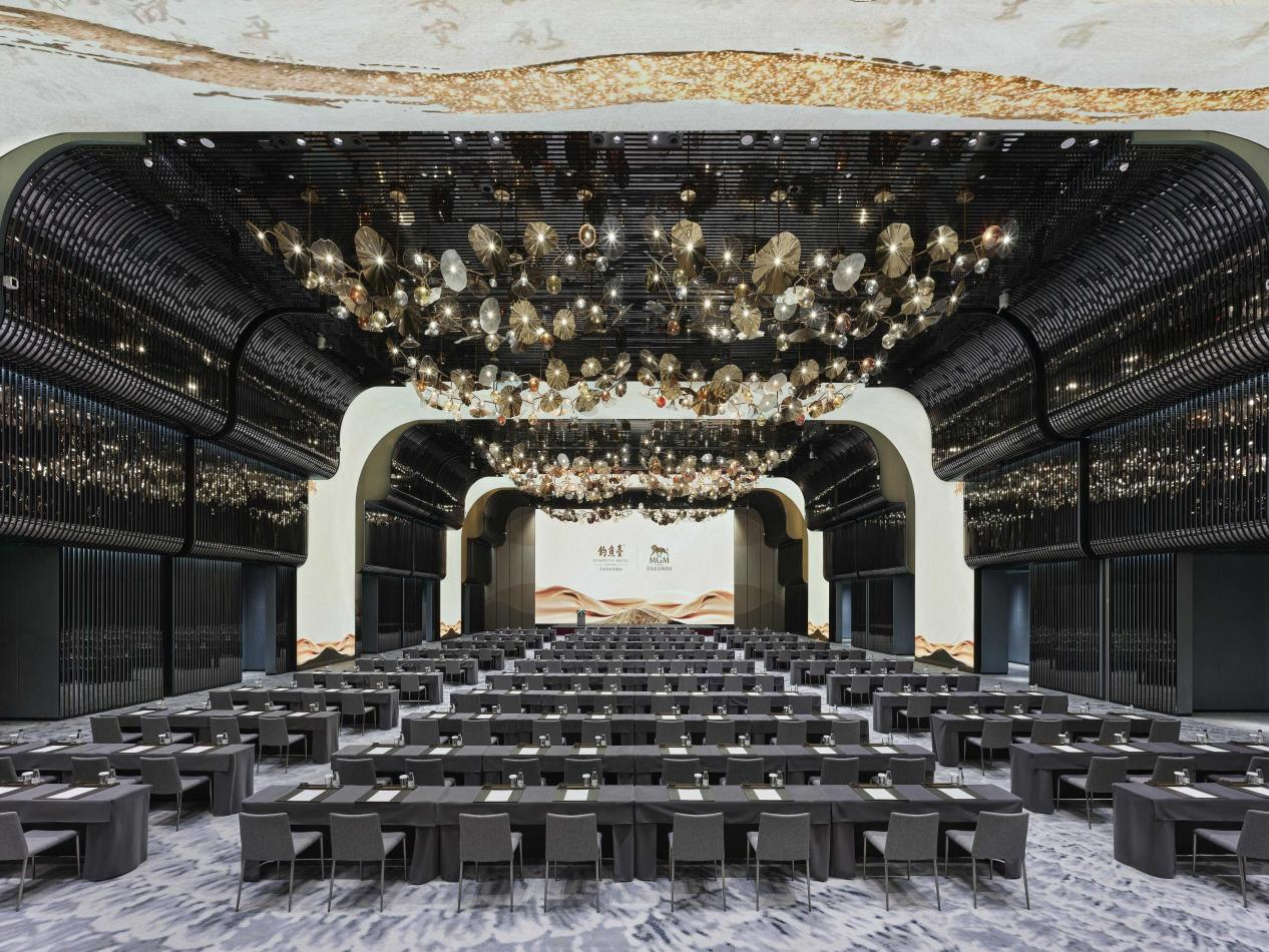 美高梅大酒店的大型宴会厅,被誉为能完美承接各类顶级豪华盛典的理想场所。宴会厅内部的设计精美绝伦,每一个细节都经过精心雕琢:灵动的水晶灯如同盛开的花田布满宴会厅上空,手工吹制的玻璃球和金属叶片以巧妙的方式相连,为活动增添些许欢快的元素。