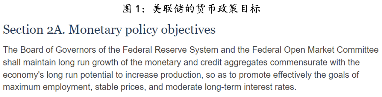 美国《联邦储备法》(Federal Reserve Act)对美联储货币政策目标的法律界定是“应保持货币和信贷总量的长期增长,使其与经济长期潜在增长率相匹配,从而有效地促进实现最大就业、稳定物价和适度长期利率的目标。”换而言之,美联储被法律赋予了“2+1”的政策目标:“充分就业与物价稳定”+“合意中性利率”。