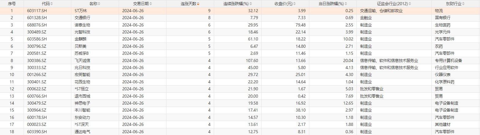 6月26日,Choice数据统计,今日1只个股连续9天上涨,为ST万林;1只个股连续8天上涨,为交通银行;此外,诺泰生物、光智科技2只个股连续6天上涨;金麒麟、贝斯美2只个股连续5天上涨。