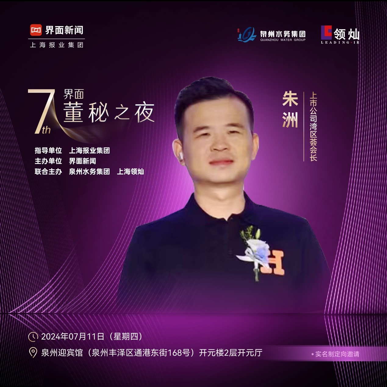 上市公司湾区荟会长朱洲确认出席【2024董秘之夜】。与此同时,晚宴现场,联合主办方泉州水务集团有限公司、上海领灿也将带来精彩纷呈的专业分享、解读。