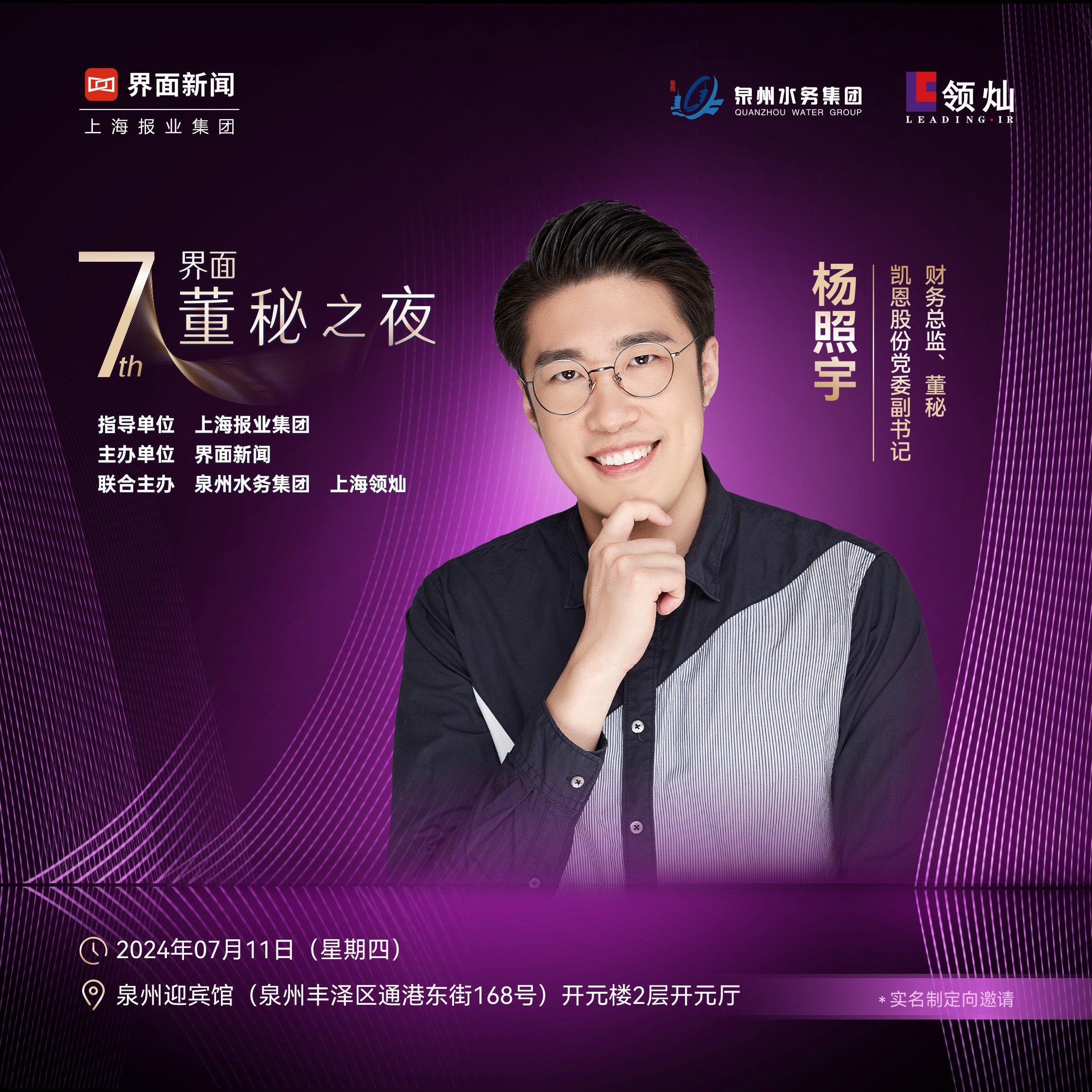 凯恩股份党委副书记、财务总监、董秘 杨照宇确认出席【2024董秘之夜】。与此同时,晚宴现场,联合主办方泉州水务集团有限公司、上海领灿也将带来精彩纷呈的专业分享、解读。