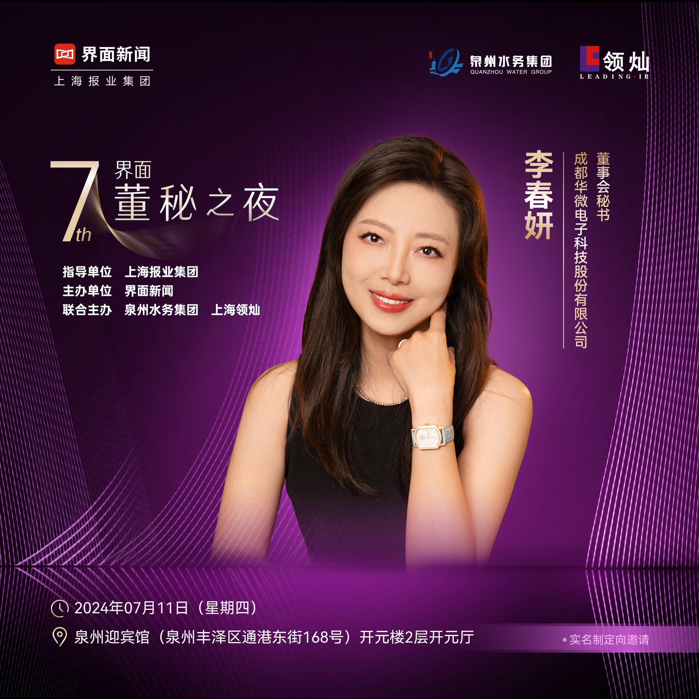 成都华微电子科技股份有限公司董事会秘书李春妍确认出席【2024董秘之夜】。与此同时,晚宴现场,联合主办方泉州水务集团有限公司、上海领灿也将带来精彩纷呈的专业分享、解读。