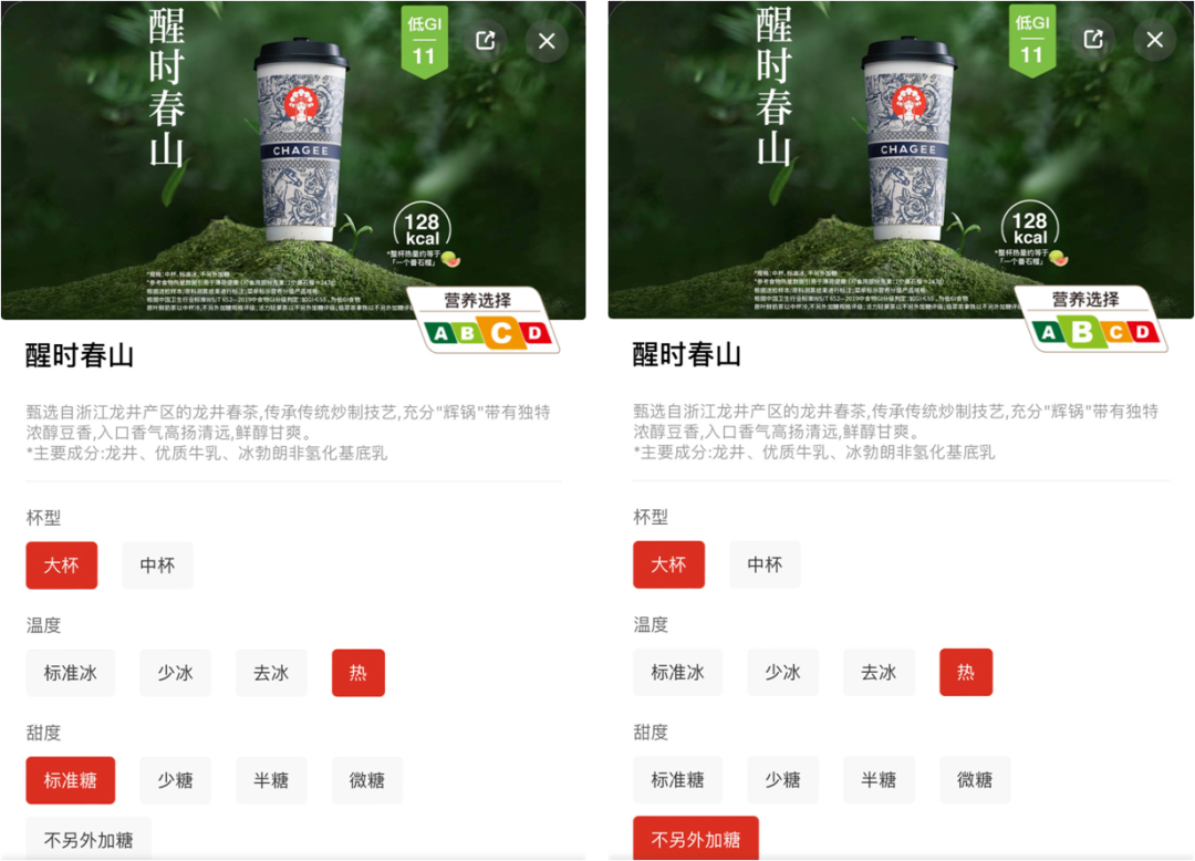 这个标识并非固定不变,而是会根据消费者的选择动态变化。比如在原叶鲜奶茶的细分项里,当零售君选择一杯“醒时春山”,并点了“热+标准糖”的选项后,这杯奶茶的营养标识旋即显示为“C”,当零售君将“标准糖”改为“不另外加糖”后,该标识即刻又调整为“B”。
