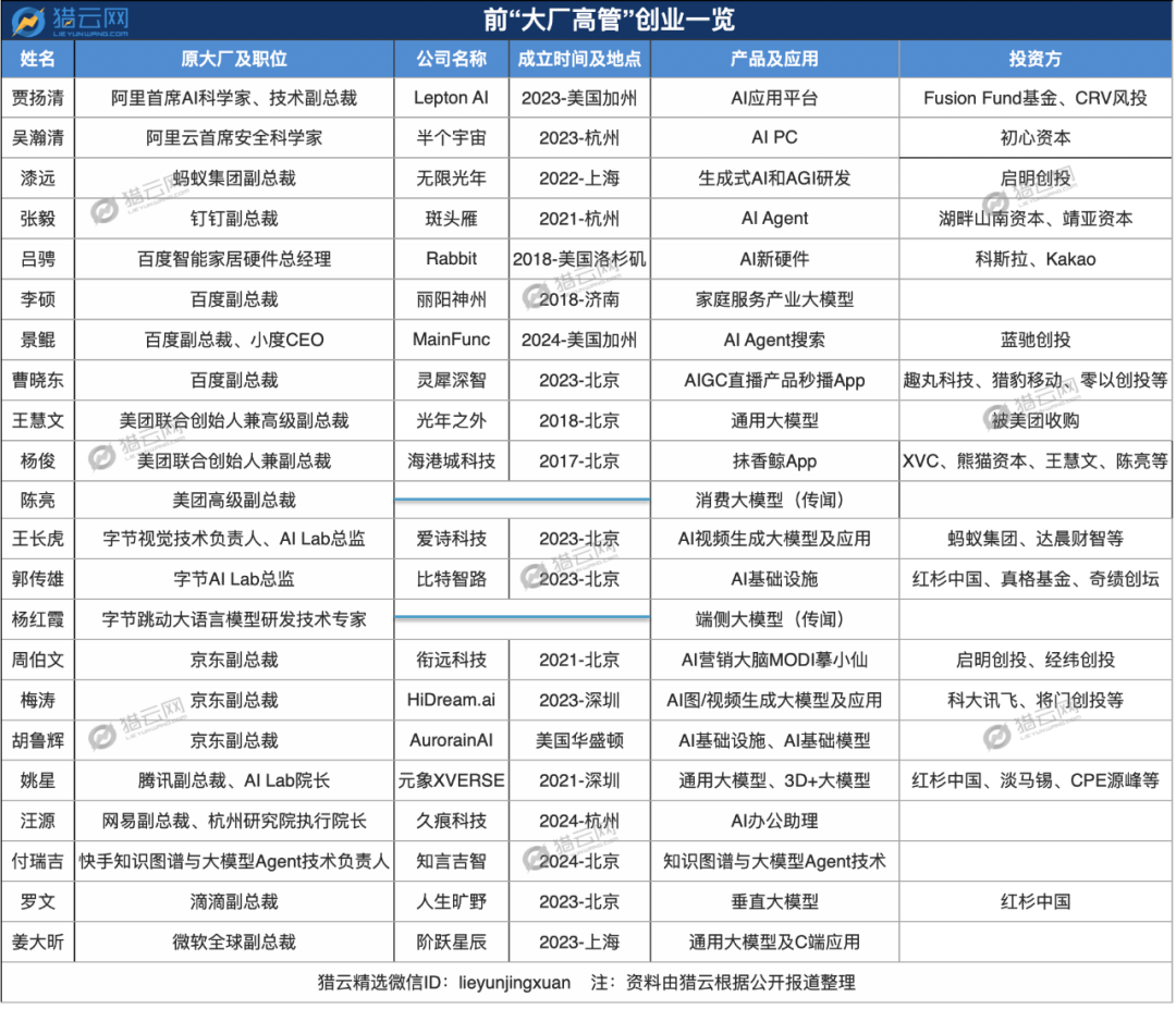 2023年2月,前美团联合创始人兼高级副总裁王慧文率先下场,随后百度、阿里、腾讯、字节、京东、网易等互联网大厂高管,相继开启大模型创业。
