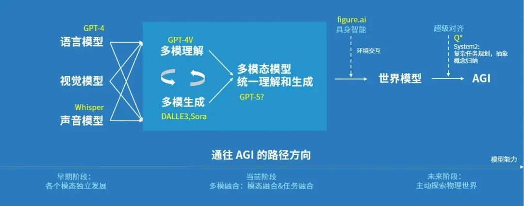 阶跃星辰表示,基于“多模理解和生成的统一是通往AGI的必经之路”这个认知,团队认为,模型的演化必然会经历单模->多模->世界模型三个阶段,“OpenAI就是一直在沿着这样的一条主线、两条支线推进它的AGI计划”。