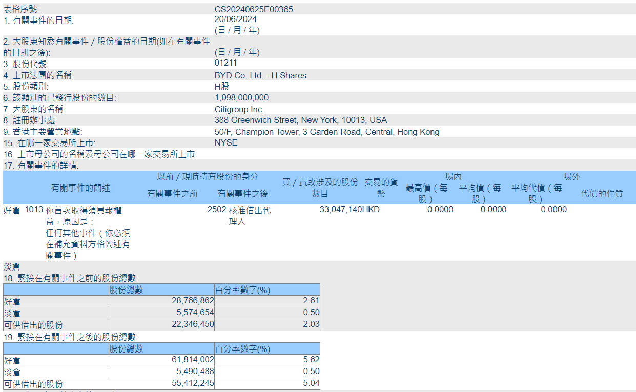 比亚迪股份:花旗集团持有公司多头仓位从2.61%升至5.62%
