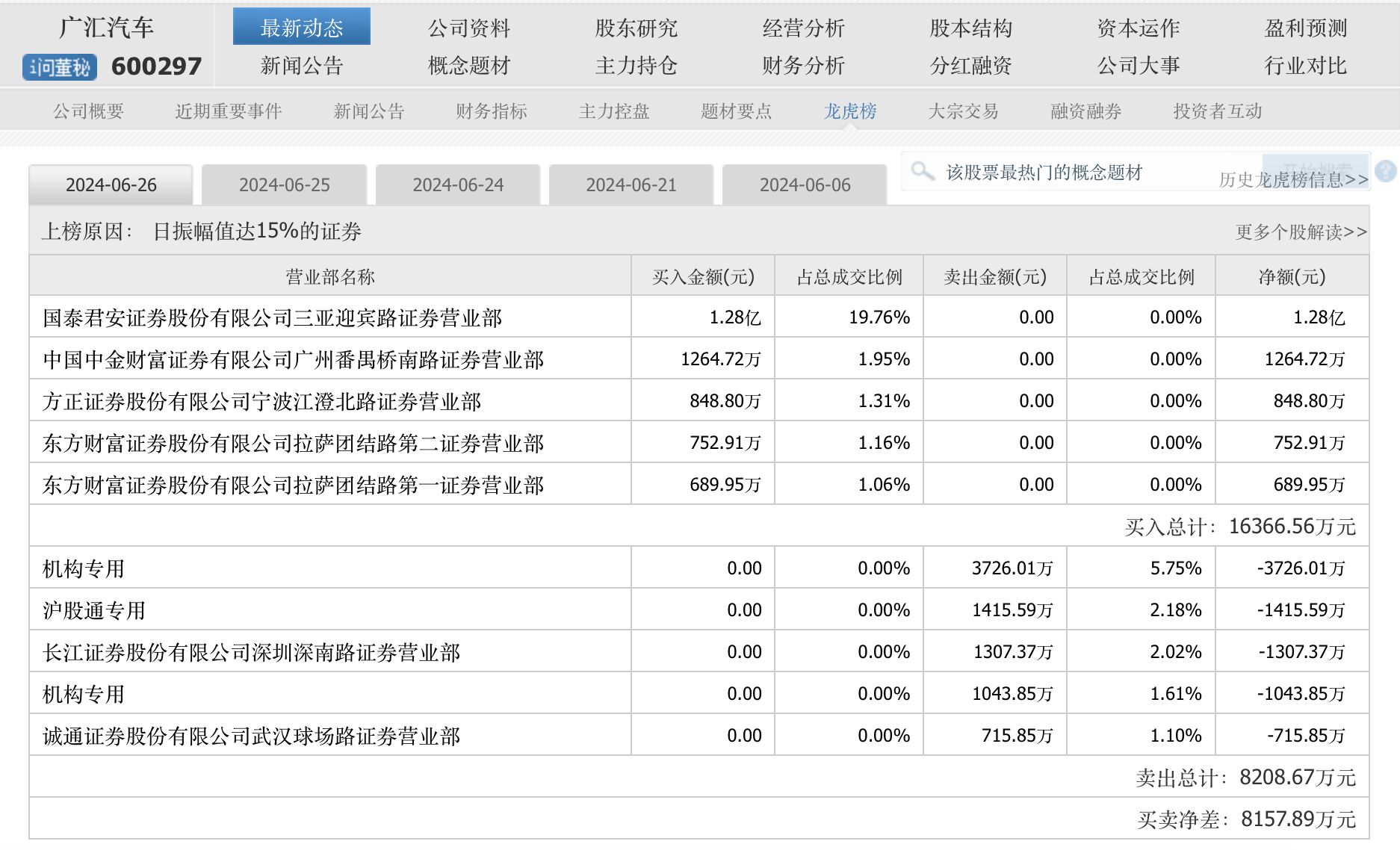 6月19日公告显示,广汇集团增持额目前已经超过了5000万元,公告表示,广汇集团的增持计划尚未实施完毕。未知6月26日国泰君安三亚迎宾路营业部的疯狂做多,是否与广汇集团有关?