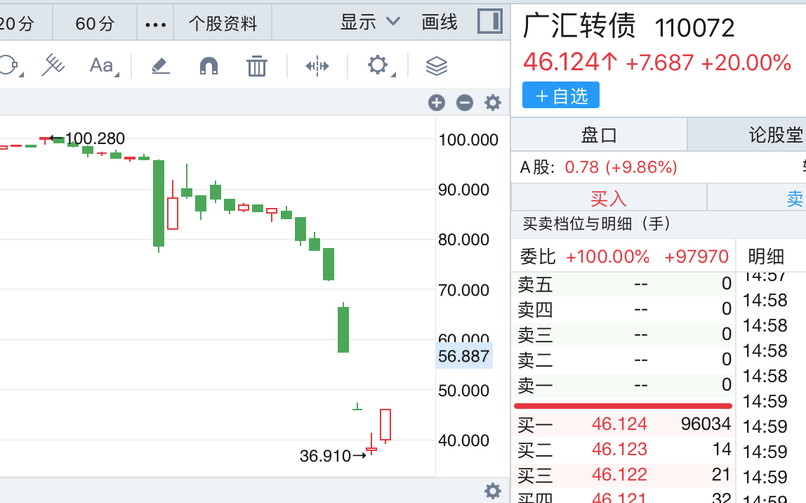 正股如此,广汇转债当天也同样完成了涨停,截至收盘,现价回到了46.124元。而在此之前,广汇转债累积跌幅超过了50%,触及严重异动。