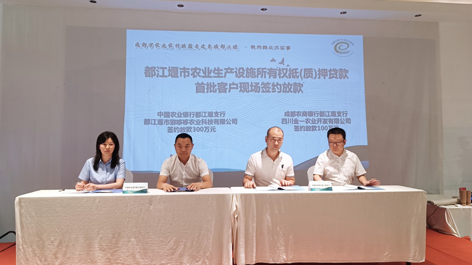 为支持农业经营主体可持续发展,活动期间,农行都江堰支行、成都农商银行都江堰支行与都江堰猕哆哆农业有限公司、金一家庭农场,分别签订了以农业生产设施抵为核心有效押品的贷款配套合同,首批放款400万元,标志着以农业生产设施作为贷款有效押品的融资模式获得金融机构认可,实现了农业生产设施“贷”动乡村振兴改革实验的首发落地,为成都市推广提供了可借鉴、可复制的普适经验。
