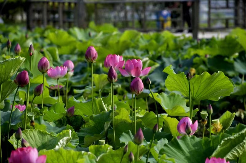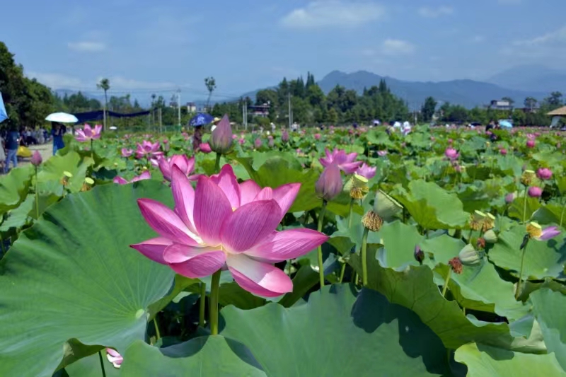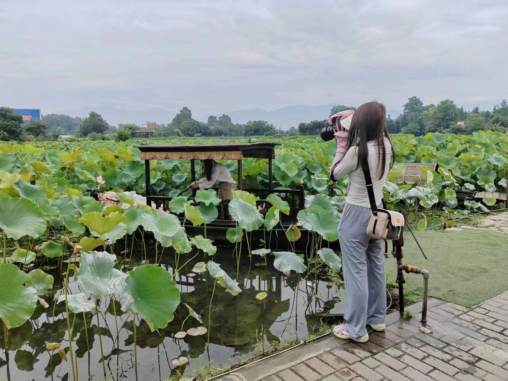 置身观景台可见,翠绿的荷叶犹如翡翠般镶嵌在池塘中,粉色的荷瓣在夏日阳光的照耀下,显得格外娇艳与美丽动人。一阵清风吹过,荷叶上下翻动,荷花随风起舞,淡淡清香扑鼻而来,沁人心脾,令人心旷神怡。深入荷塘,游人不时寻找合适的角度,用手机定格美丽瞬间,一幅动中有静、静中有动的画卷让人沉醉不知归路。都江堰市民佟俐萍首次到此赏荷,她说:“听姐妹们说这儿的荷花特别漂亮,于是今天约上朋友来此打卡,来了后感觉确实很美,让我们忍不住疯狂拍照、拍抖音,今天朋友圈都被我刷屏了。这儿除了赏荷,还有很多美食,让人感叹不虚此行,我们玩得很开心。”