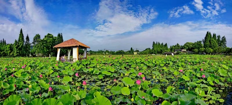 据了解,十里寨的荷花色泽鲜艳,特别出片,每年6至8月荷花盛放期总能吸引来自成都周边的众多游人到此赏荷。十里寨老板尹兵是一名返乡创业者,在此经营集美食、品茗、休闲于一体的十里寨,就是希望能为家乡发展添砖加瓦,让自己和周边居民尽快走上共同富裕的道路。尹兵说:“我这儿的铁锅焖大鹅、柴火鸡等美食深受游人喜爱,我们的食材绿色生态又新鲜,再配上秘制的泡菜、调味料、豆瓣儿炒出香味后焖熟,味道相当巴适,很多游人都是回头客。”