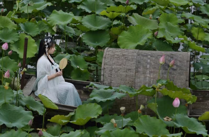 “常记溪亭日暮,沉醉不知归路。兴尽晚回舟,误入藕花深处……”原以为乌篷船上的荷塘美景只会在江南呈现,没想到,在天马镇建华社区的永兴葡萄园荷园里竟也惊艳眼前。这不,身着汉服的游人正在乌篷船上定格美好时光。