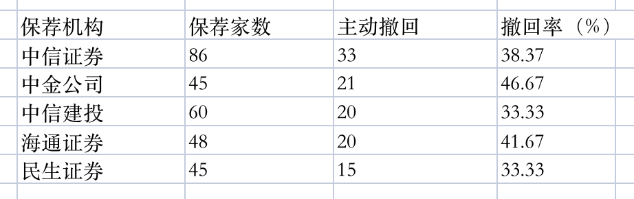 从数量来讲,位列中信证券之下的中金公司,其保荐项目45个,主动撤回的有21个,撤回率46.67%;中信建投,其保荐家数60家,主动撤回家数20家,撤回率33.33%;海通证券48个项目中有22家主动撤回,撤回率41.67%;民生证券45个项目有15个主动撤回,撤回率33.33%。
