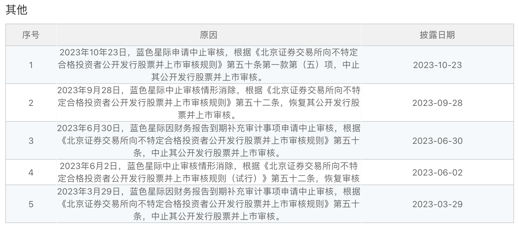 从披露来看,蓝色星际此前也多次申请中止。比如2023年3月29日公司因财务报告到期补充审计事项申请中止,2023年6月2日消除中止审核情形。2023年6月30日,公司再度因财务报告到期补充审计事项申请中止审核,2023年9月28日消除。但最近一次申请中止,北交所网站上却并未披露缘由。