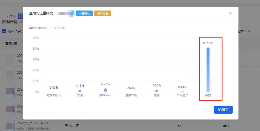 另有业内人士透露,从抖音精选联盟后台可以看到,温博士近期的流量构成明细显示,来自短视频引流、关注、搜索而来的流量微乎其微,其他付费流量占比则高达83.16%。